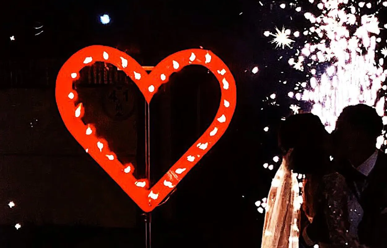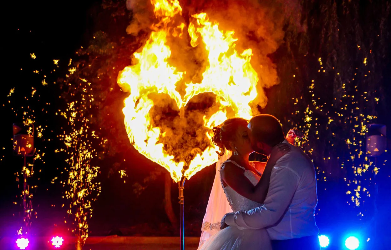 Предлагаем отличный сценарий свадебного фейерверка – наземная пиротехническая группа: пиротехническая дорожка из фонтанов, 2 огромные фейерверк вертушки по типу огненного колеса, горящие огненные 2 сердца, что сплетаются во едино, затем многоплановый парковый фейерверк, и только за ним крупнокалиберный высотный салют. Особое внимание следует уделить свадебному фейерверку «Горящие сердца», что особо может подчеркнуть торжественность момента и станет уникальным украшением праздничной площадки для свадьбы. Также оригинальным украшением свадебного праздника послужат наземные пиротехнические фигуры и фейерверк надписи. Если у Вас есть желание с размахом отпраздновать свадьбу или юбилей, яркое пиротехническое шоу – прекрасный способ сделать мероприятие незабываемым. Звоните и заказывайте горящие сердца из фейерверка на свадьбу – ваши идеи реализуют профессионалы!